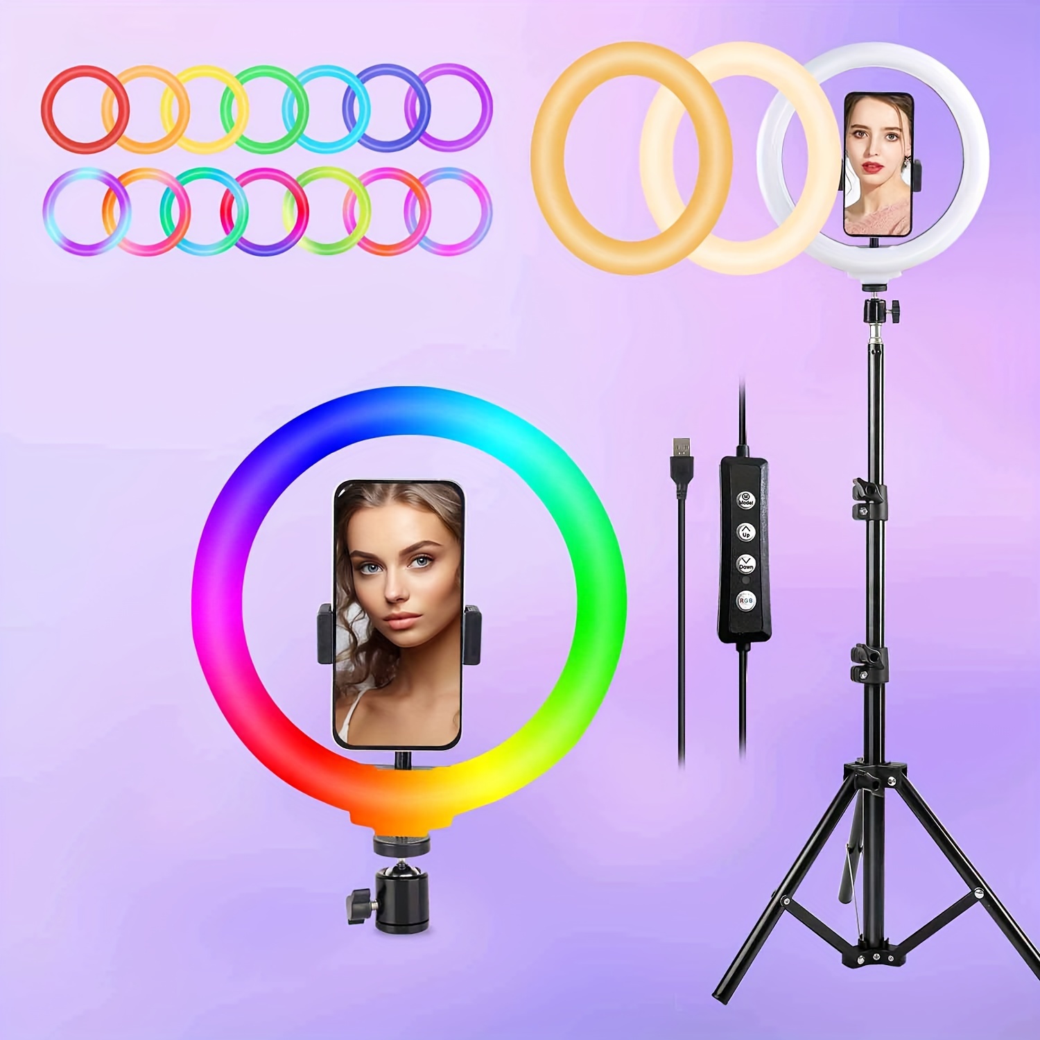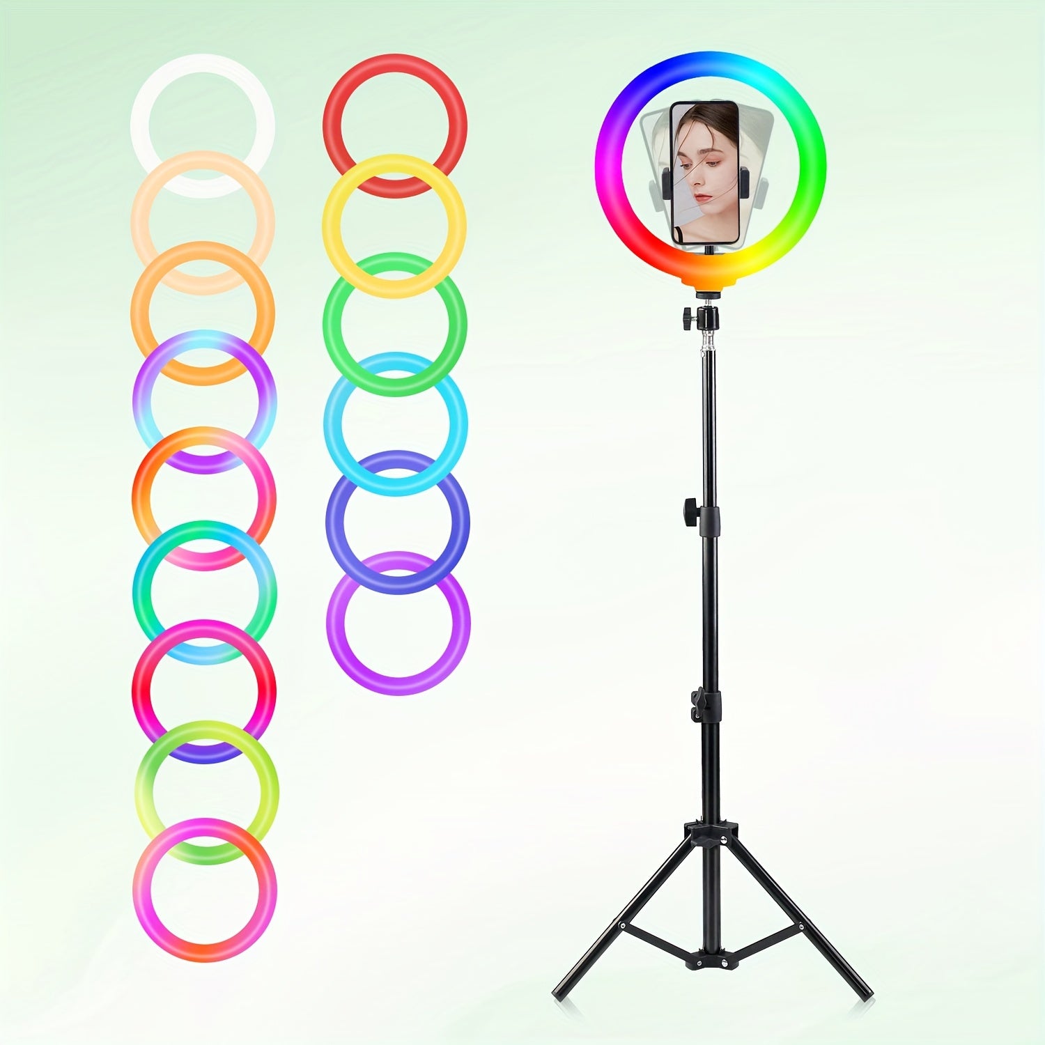 10" Ring Light and Adjustable Stand With 2 Phone Holders - 38 Vibrant Color Modes with Stepless Dimming/Speed Control - Perfect for Makeup, Photography, and Live Streams