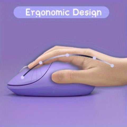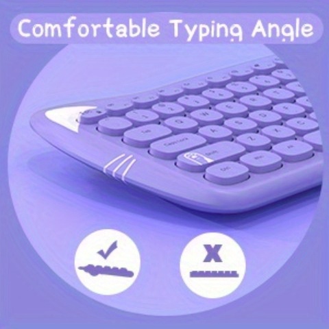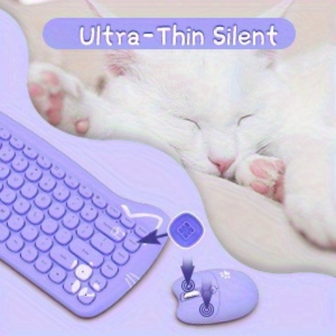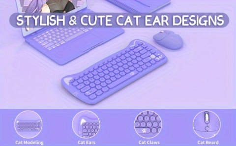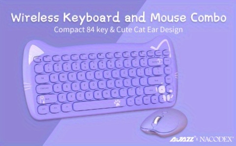 AJAZZ Purple Wireless Keyboard And Mouse, Portable 84 Key Round Key Cute Cat Ears Office Thin Keyboard, 2.4GHz Silent Click Mouse With 3 Adjustable DPI For Windows Laptop PC Notebook