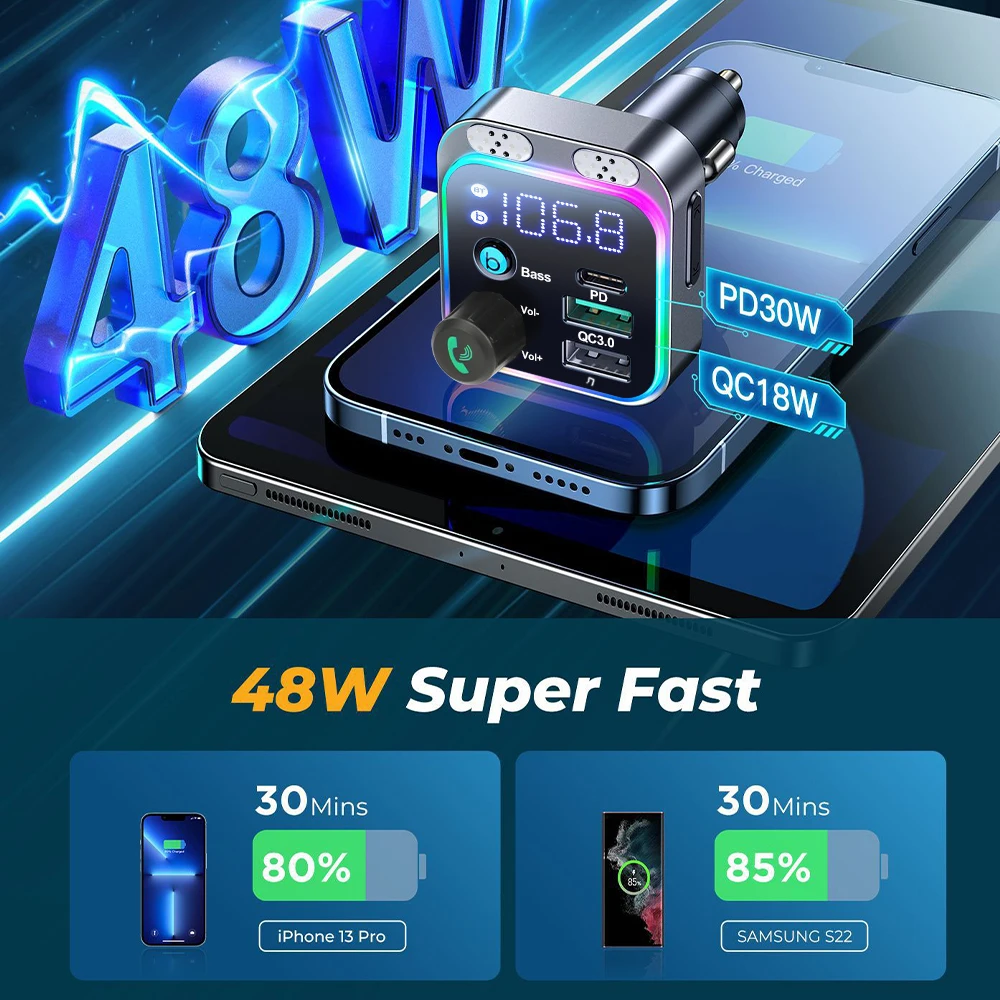 2. [48W PD&QC 3.0 Fast Charging] Bluetooth FM Transmitter is equipped with PD 30W Type-C and QC3.0 18W USB charging port, fast charging two devices at the same time. Support For Samsung super fast charging and ipad pro/iphone Moto/LG/Android device fast charging. This 48W high power car adapter charges faster than 99% of Bluetooth car adapters on the market