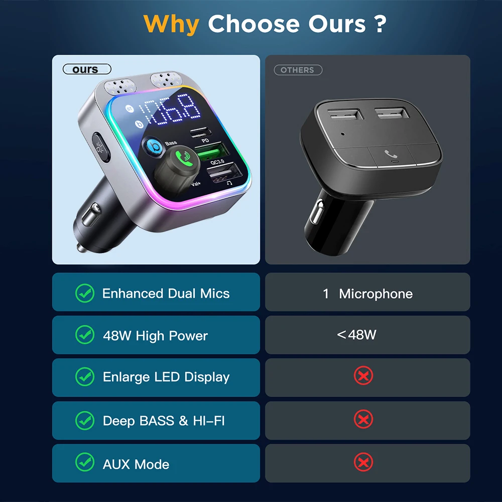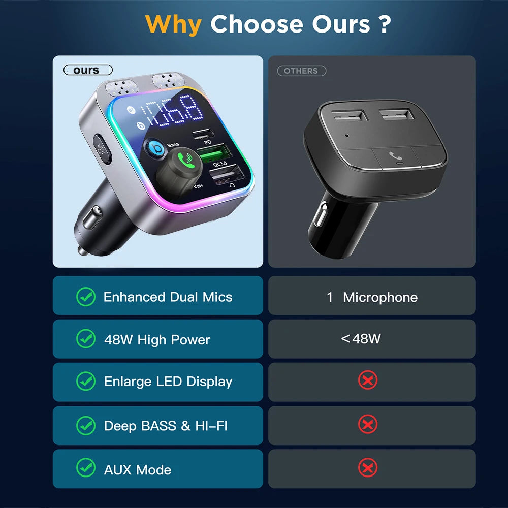 3. [Upgraded Bluetooth 5.0] FM transmitter uses the latest Bluetooth 5.3 technology, optimizing the transmission delay and connection defect problems of the old Bluetooth 5.0. Bluetooth 5.0 will bring you a faster, more stable and smarter connection with less sound quality loss. Uninterrupted calls and music experience. It takes only 1 second to complete pairing, and no need to repeat pairing after the first successful pairing with your device