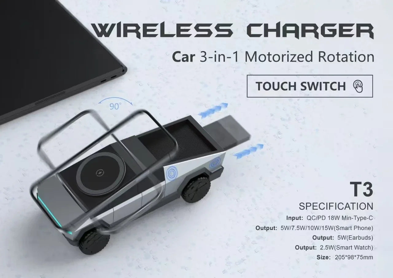 T3 WIRELESS CHARGER Car 3-in-1 Motorized Rotation TOUCH SWITCH