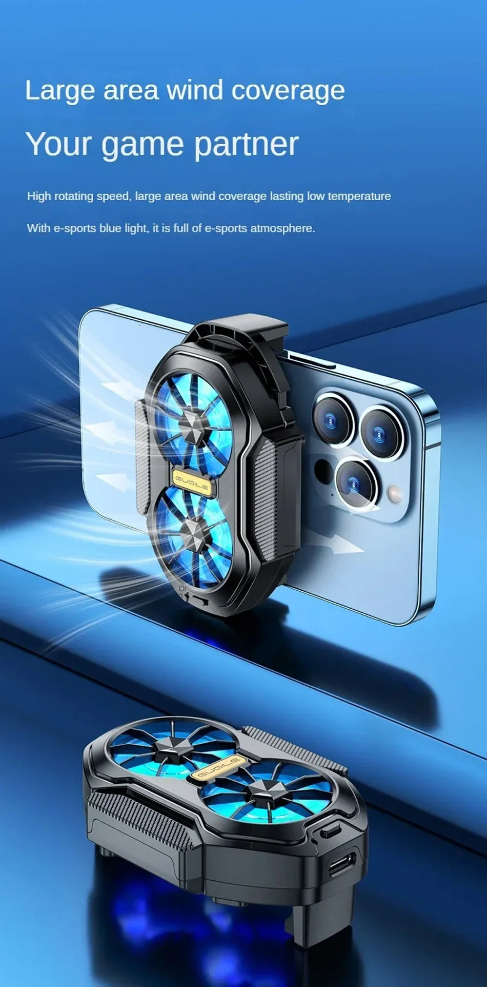 1. Dual Fan Cooling Technology: The mobile phone cooler is equipped with dual cooling fans featuring quiet turbine technology capable of generating strong airflow while maintaining low noise levels. High-speed operation and wide-area coverage ensure your device stays cool, complemented by esports blue light for an immersive gaming atmosphere.