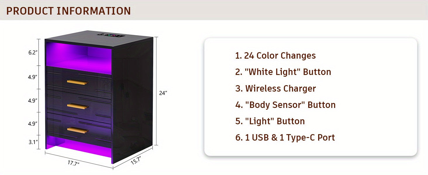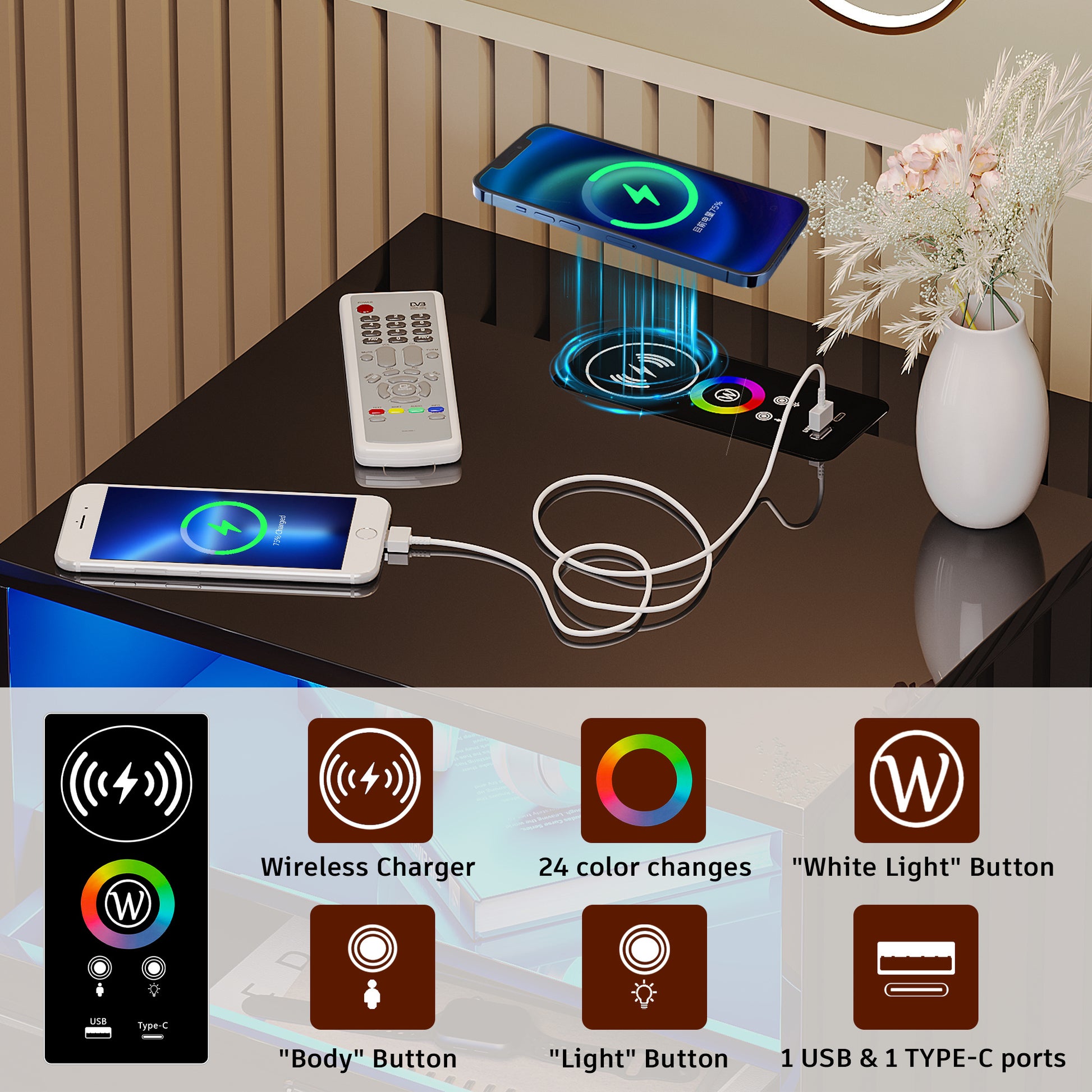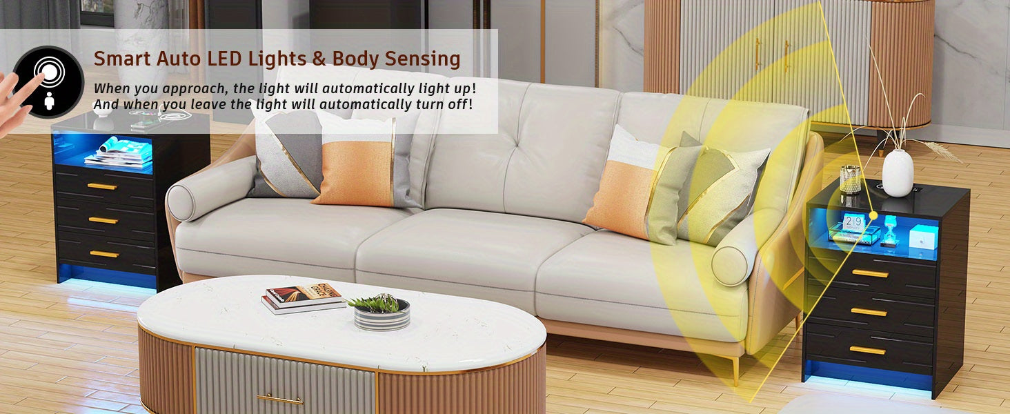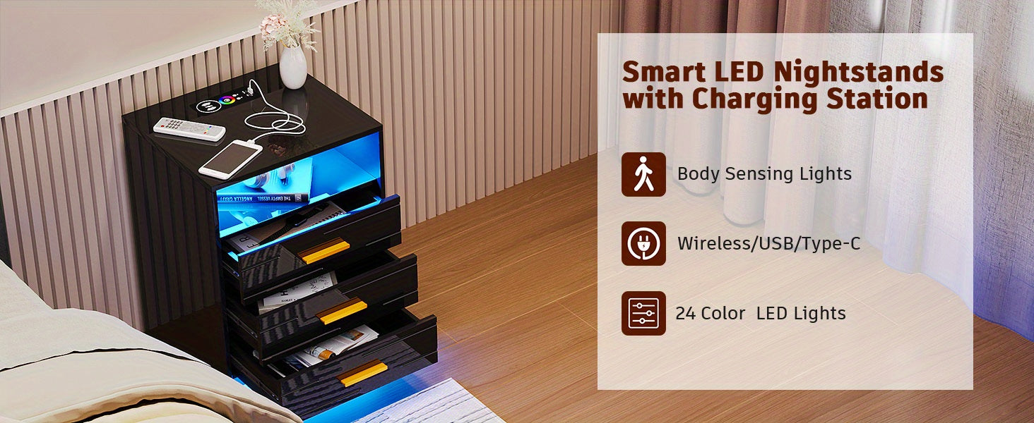 HWB RGB LED Nightstand with Wireless Charging Station, Smart Night Stand with Motion Sensor Lights, High Gloss White Nightstand with 3 Drawers for Bedroom, Modern Bedside Tables