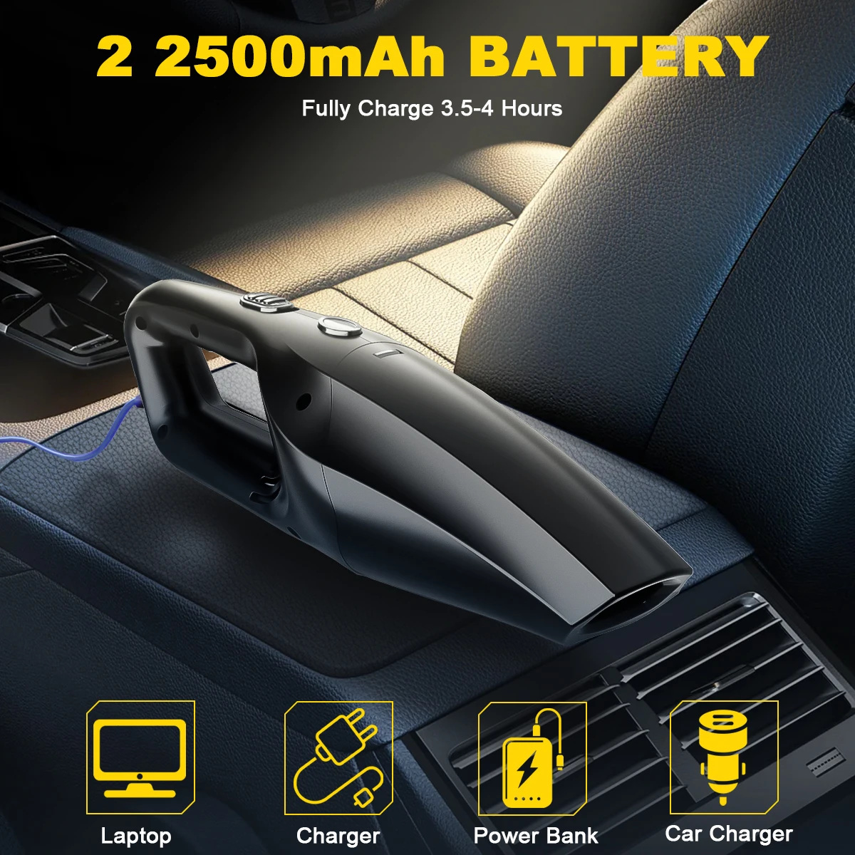 ANYWHERE ANYTIME: Fully charges in just 3-4 hours and can be used for up to 20 minutes. When you need to use your car vacuum cleaner but find that the battery has run out, Simply plug the power cord into your car's cigarette lighter and press the power button to start cleaning! Mini vacuum cleaner is suitable for all cars, trucks, vans and motorhomes.