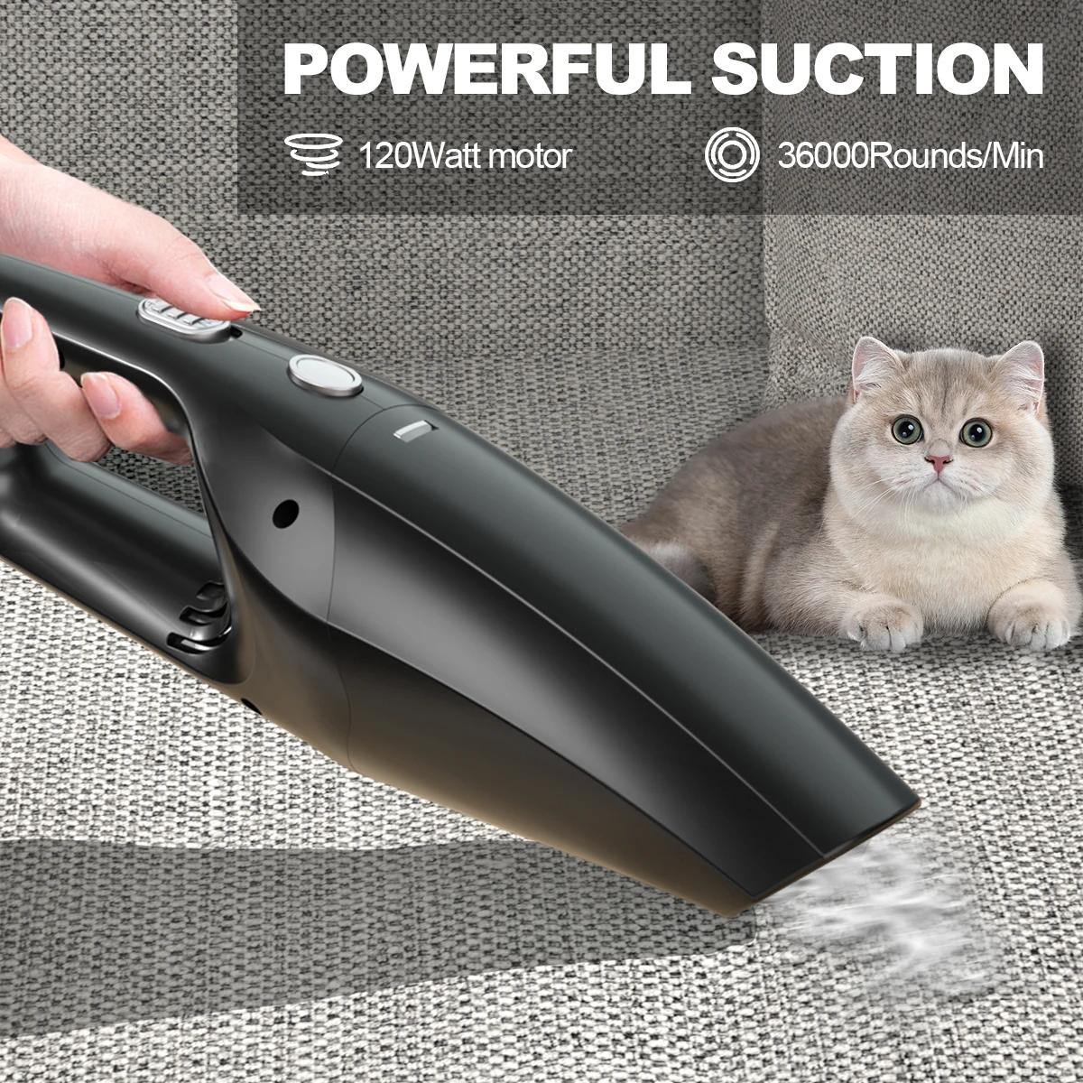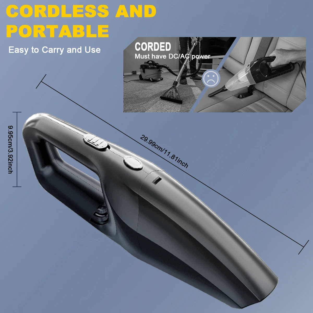 4300PA POWERFUL SUCTION: Car Vacuum features an improved motor with suction , not only does it extend the life of the handheld vacuum cleaner, but it also minimizes noise and disturbance to others.. Extra powerful motor and long battery life helps you to do a complete cleaning. Quickly removes dust, debris, dog hair, dirt, sand or crumbs.