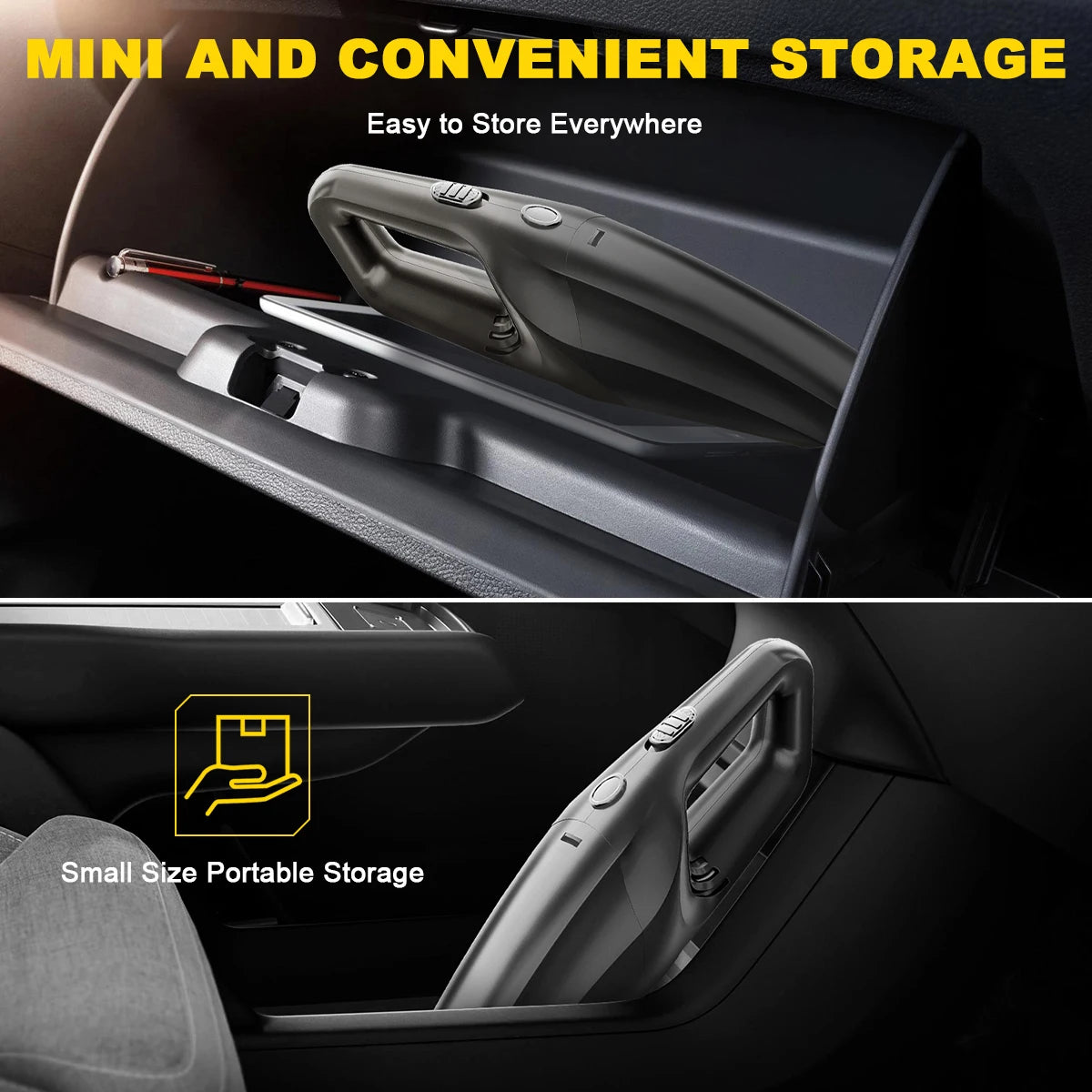 SMALLER BUT CLEANER: Only 0.36 kg! That's about the same weight as a bottle of water. With this cordless handheld vacuum, you can remove any dirt effortlessly. Just small and portable, you can put it in your car's trunk/storage box when you're done using it to save space, and the included storage bag makes it easy to hang it anywhere. Enjoy a tidy car life with the best rechargeable hand held vacuum.
