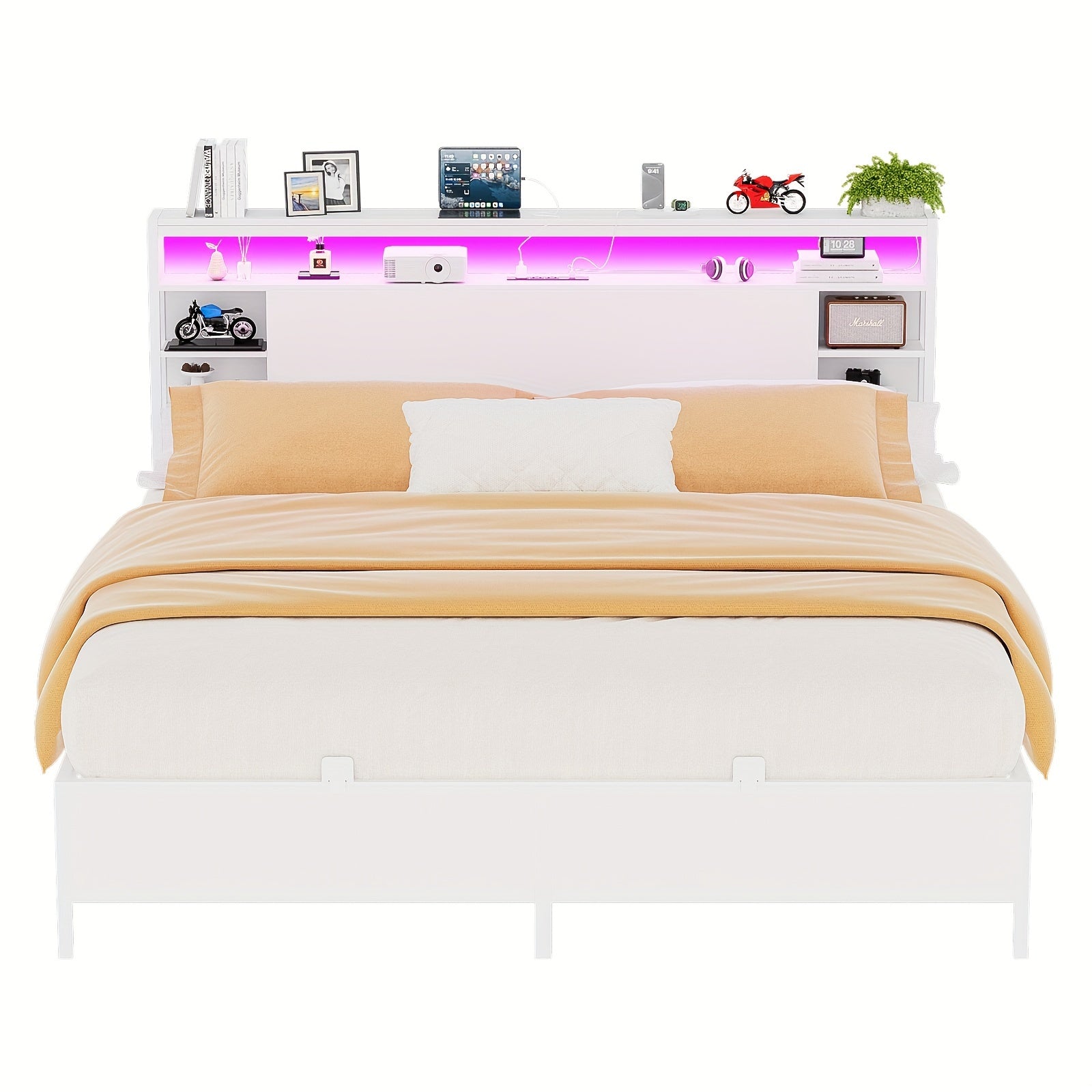 Unikito King Size Bed Frame With Storage Headboard, Power Socket And Smart LED Lights, Sturdy And Stable Platform Bed, Heavy Duty Metal Slats, Noise Free, No Box Spring Needed, Easy To Assemble, White