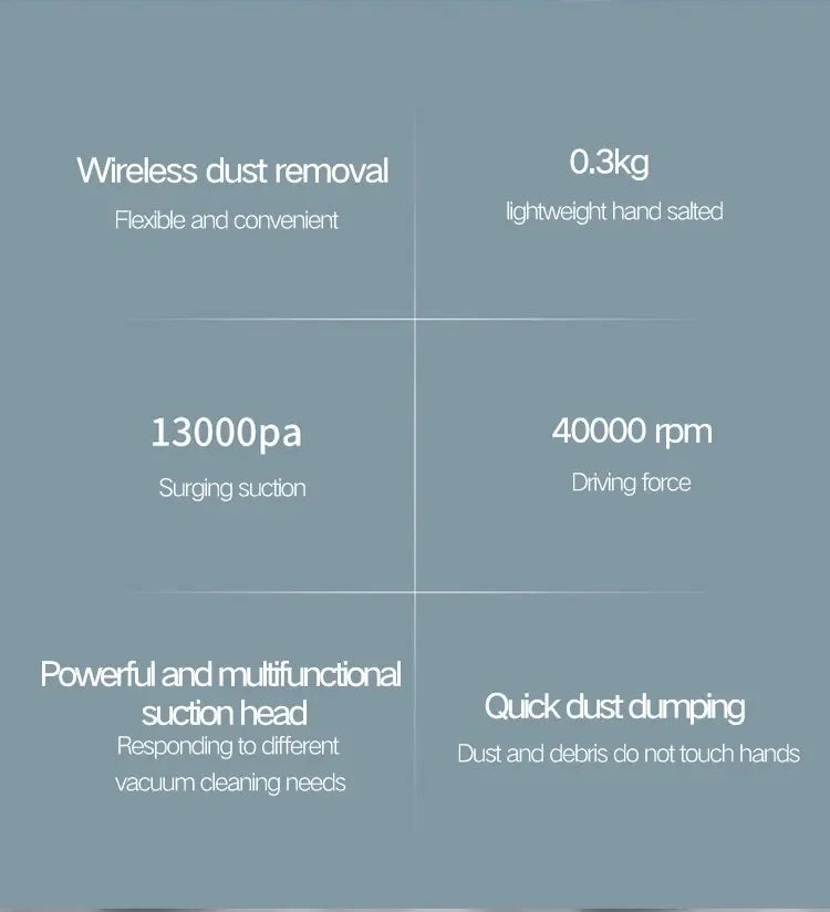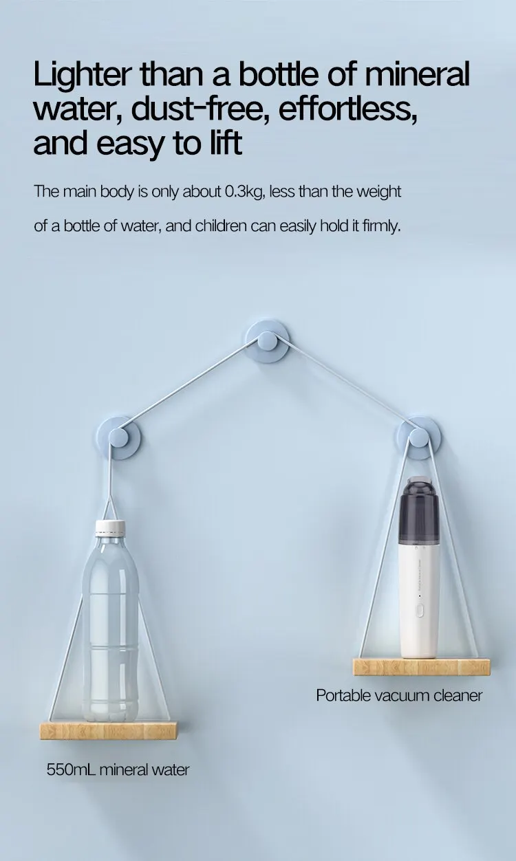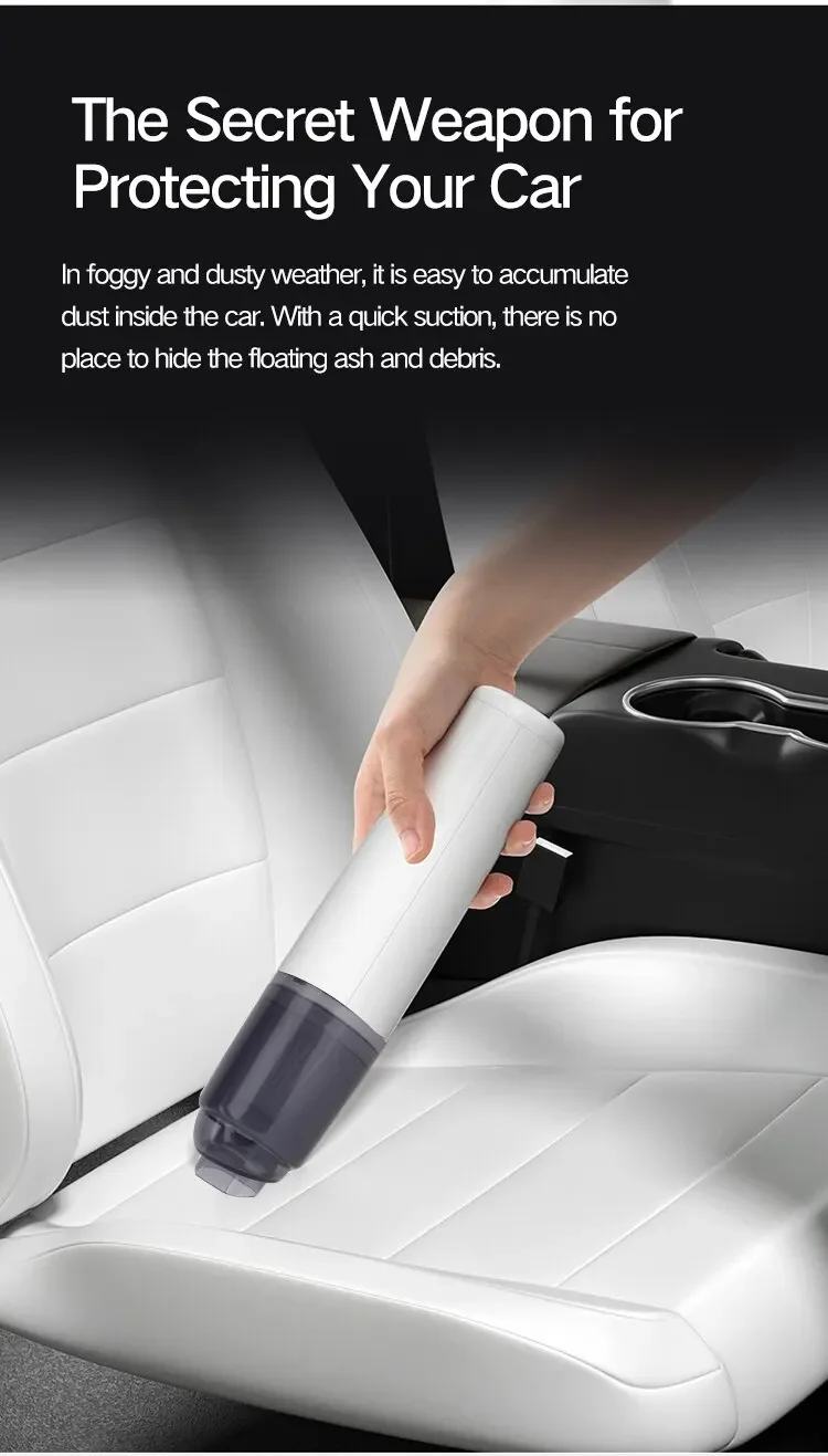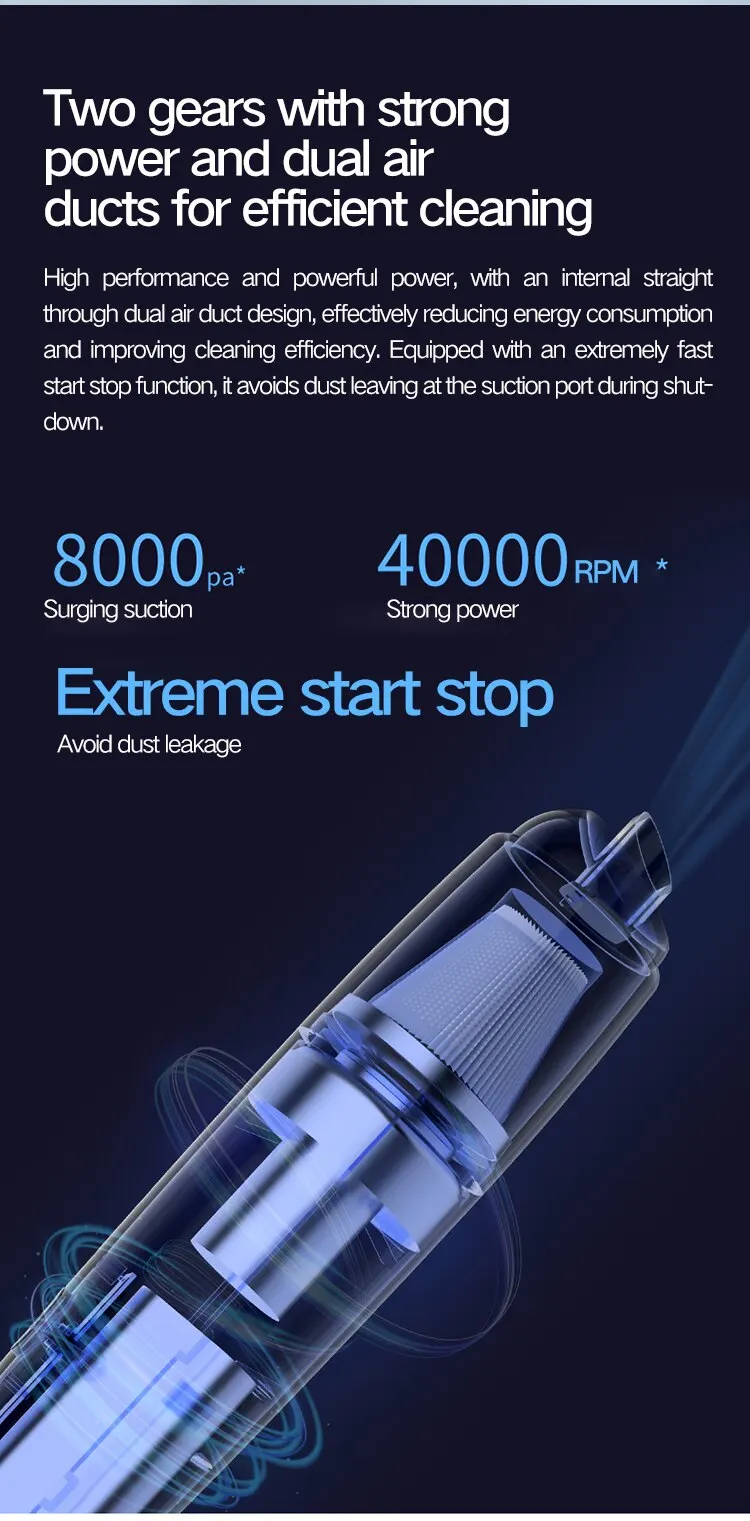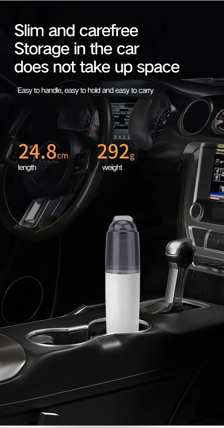 1. Powerful suction and long running time The high-speed brushless motor of the vacuum cleaner provides a powerful cleaning power, which lasts for about 25-30 minutes. It can quickly and deeply clean almost any small place that is hard to reach, such as the car interior, sofa, carpet, furniture, and even your keyboard!
