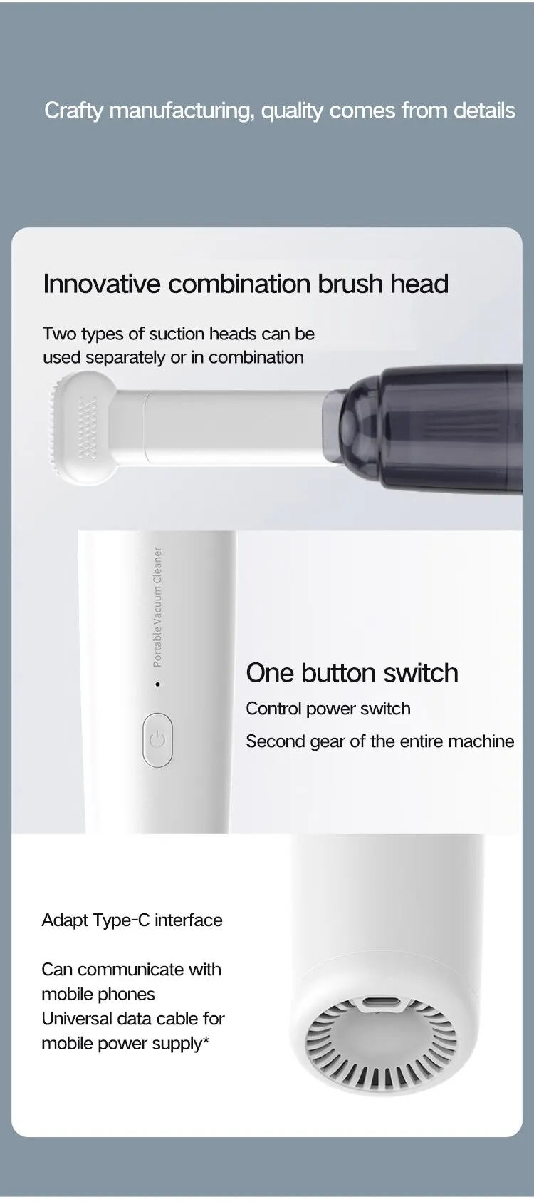 3. The unique design and practical, fashionable and compact design completely upgrade the traditional small hand-held vacuum cleaner. It can help you clean dark corners or at night. The indicators help you know when to charge. Two in one slit tool and air hose can help you clean more efficiently and carefully.