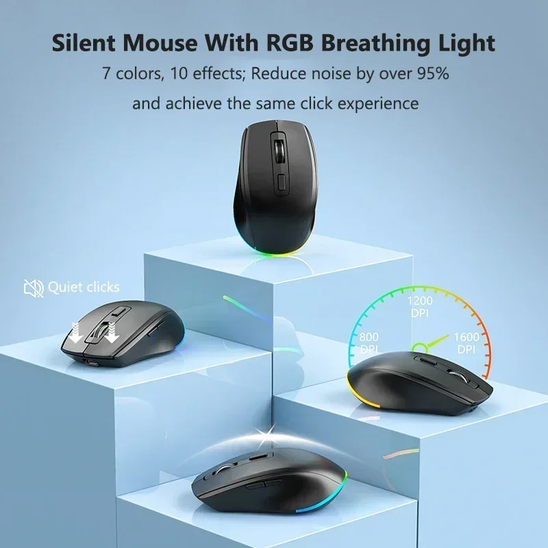 * Silent mouse with RGB breathing light, 7 colors, 10 effects, noise reduction of more than 95%, get the same click feeling.